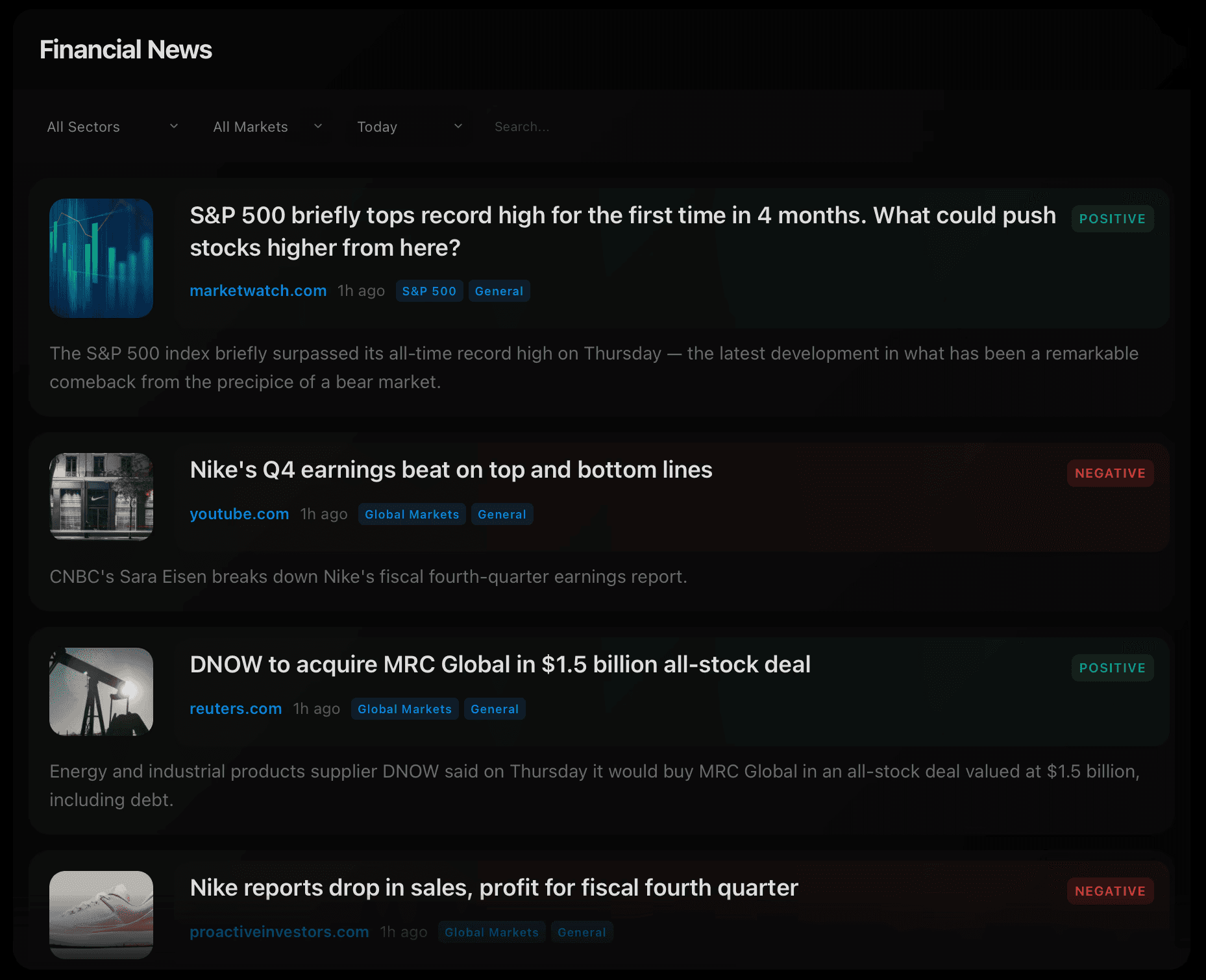 Reduce the noise with AI news sentiment, categorising every news article into positive, negative, or neutral signals for investors to instantly gauge the tone of the news and