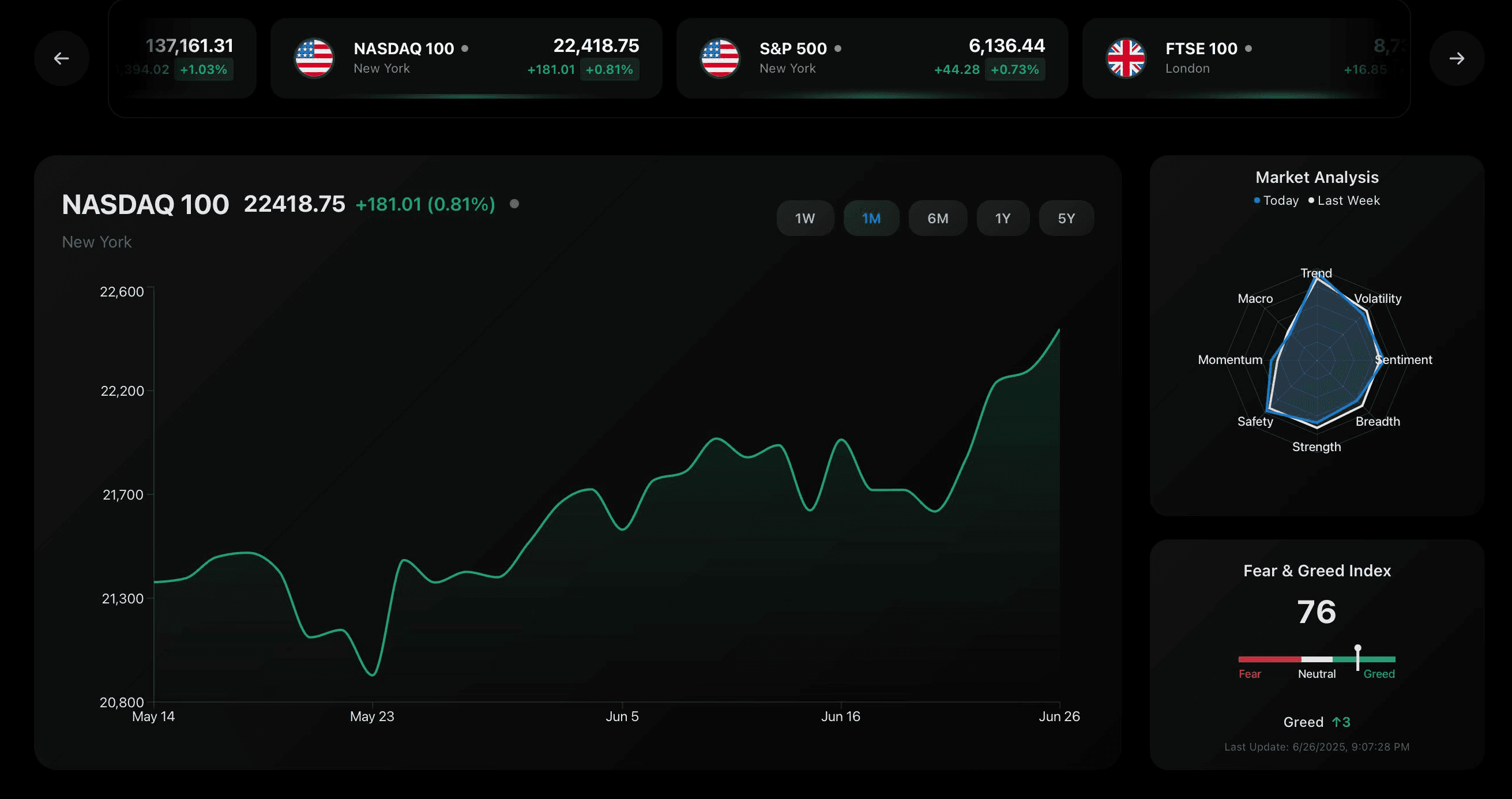 Monitor driving forces behind any market with a single glance through market radar which distills robustness in market health into subcomponents like trend, momentum, volatility, sentiment, and so on to spot inflections in market dynamics.