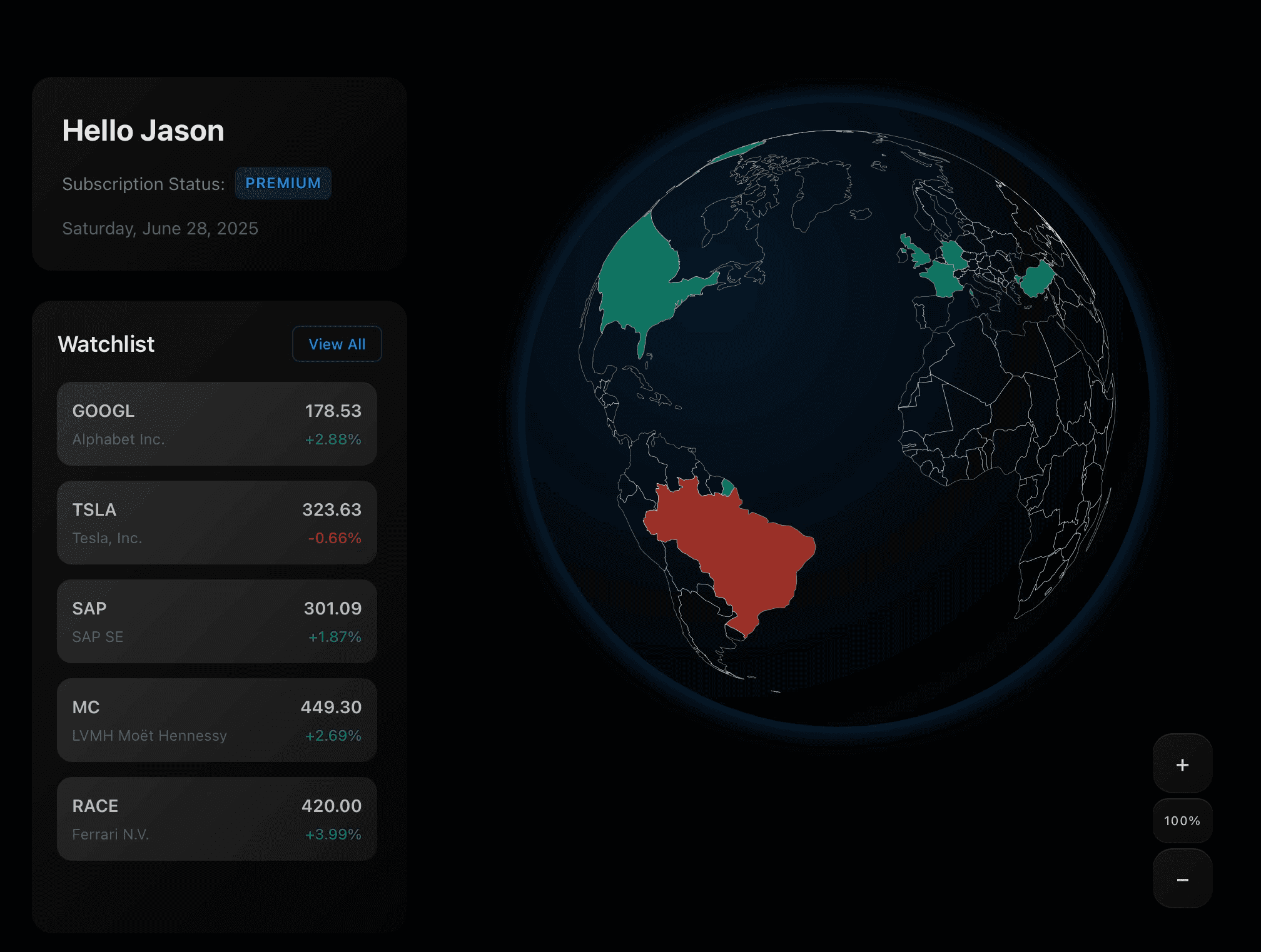 Maintain a wide horizon of market performances across continents through our dynamic globe highlighting real-time movements, reflecting shifts in momentum instantly.